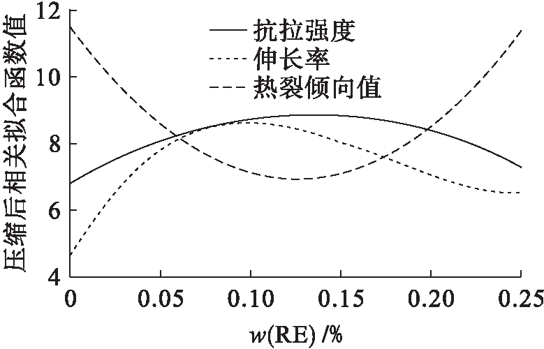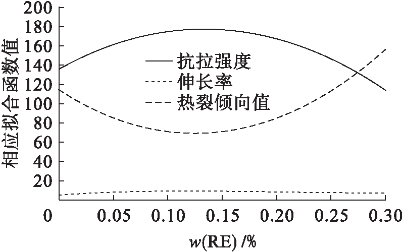 图2 单独添加稀土时合金抗拉强度、伸长率和热裂倾向值的拟合函数