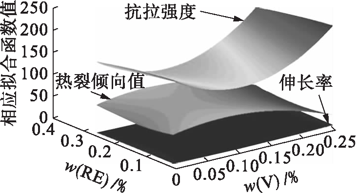 图4 混合添加钒和稀土时合金抗拉强度、伸长率和热裂倾向值的拟合函数