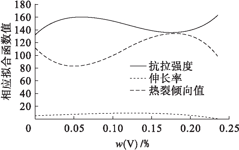 图1 单独添加钒时合金抗拉强度、伸长率和热裂倾向值的拟合函数