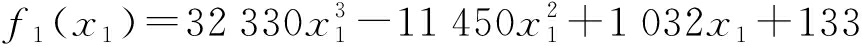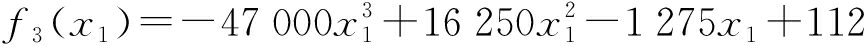 假设钒的添加量为自变量x1,此时合金产品的抗拉强度、伸长率和热裂倾向值分别为因变量f1(x1)、f2(x1)和f3(x1).利用上述多项式拟合模型,结合表1中单独添加钒方案时的实验数据,求出对应的拟合函数图像及拟合函数表达式,具体拟合函数图像如图1所示.通过图1可以得到合金获得最大抗拉强度、最大伸长率和最小热裂倾向值时对应的钒含量.
