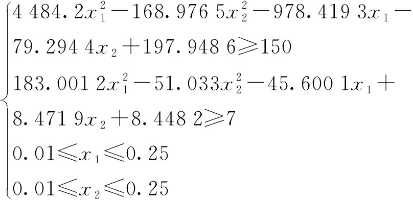 为了方便起见,采用非线性规划优化模型[8]对合金性能进行系统描述.通常在合金的抗拉强度不低于150 MPa,伸长率不低于7%,同时热裂倾向值尽可能小的情况下,合金使用率最为广泛.首先利用拟合法分别求出合金抗拉强度、伸长率和热裂倾向值关于自变量钒和稀土添加量的函数关系式,再将抗拉强度不低于150 MPa,伸长率不低于7%视为约束条件,将热裂倾向值减少到最小视为目标函数,根据两个约束条件与表1中钒和稀土的含量范围,可以得出两个自变量的可行解区域,最后在该区域内找出使目标函数值最小的点,此点即为最优解点,且最优解点的横纵坐标分别对应钒和稀土的含量.
