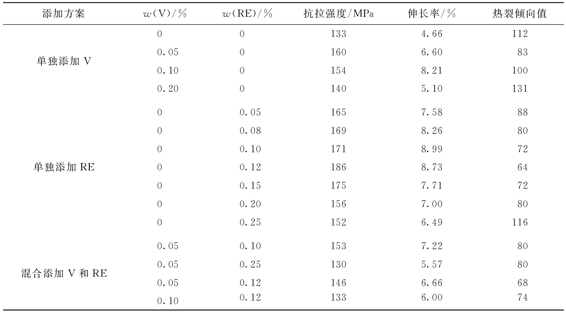 表1 钒和稀土的添加对合金力学性能和抗热裂性能的影响