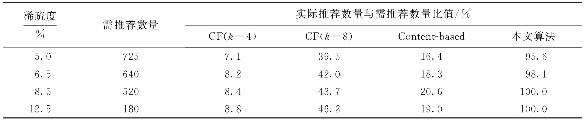 表2表示在不同数据稀疏度条件下,4种算法实际推荐数量与需推荐数量的比值.当数据极端稀疏时(稀疏度≤6.5%),4种算法都不能获取足够的推荐数量,CF和Content-based算法推荐数量比值较低,而本文算法的推荐能力受数据稀疏性的影响相对较小,推荐数量比值接近于1;当数据稀疏度≥8.5%时,CF和Content-based算法推荐数量比值有一定的提升,但仍然都小于50%,而本文算法的推荐数量比值为100%,完全能够达到需要的推荐数量.这说明在稀疏条件下,本文算法的推荐效果更好.