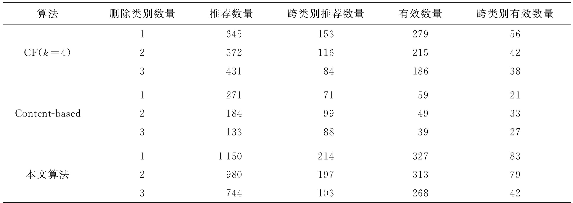表3显示了3种算法协同推荐的多样性推荐数量对比.随着删除类别数量的增多,3种算法的可推荐数量和跨类别的推荐数量都呈下降趋势,推荐的有效数量和跨类别的有效数量也都逐步下降.相比其他2种算法,在相同条件下,本文算法推荐数量更多,跨类别推荐数量也更多,与实际结果相符的有效数量、跨类别的有效数量也更多.这说明相比传统基于内容的推荐方法,本文算法能够产生更高质量的跨类别推荐结果,协同推荐的多样性更高;在冷启动的场景下,跨类推荐的数量和多样性都更优.而基于内容的方法在主题类别缺失较多的情况下,具有极低的推荐多样性,导致推荐结果过快收敛,推荐的范围往往受限.