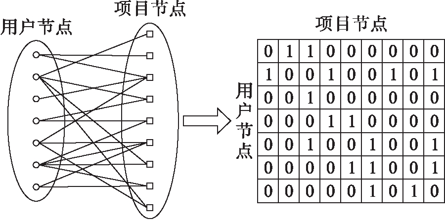 假设推荐系统中有m个用户和n个项目,令G(U,I,E)表示一个二分图网络推荐系统,为m×n阶项目评分权重矩阵,U为用户节点集,I为项目节点集,E为边集.假设用户节点数U=m,项目节点数I=n,则二分图网络节点总数为r=m+n.若用户up对项目iq的评分不为空,则Gpq=1;否则,Gpq=0.
