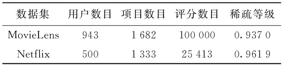 本文使用MovieLens数据集7和Netflix数据集13对算法进行评估.MovieLens数据集包含943位用户对1 682部电影的100 000条评分记录,评分值为1~5的正整数.Netflix数据集包含480 189位用户对17 770部电影的100 480 507条评分记录,评分值为1~5的正整数.由于Netflix数据集规模过大,从中随机抽取25 413条评分记录作为实验数据集.表1给出了实验用数据集的基本特征,本文将每一数据集划分为50%的训练集用户和50%的测试集用户.