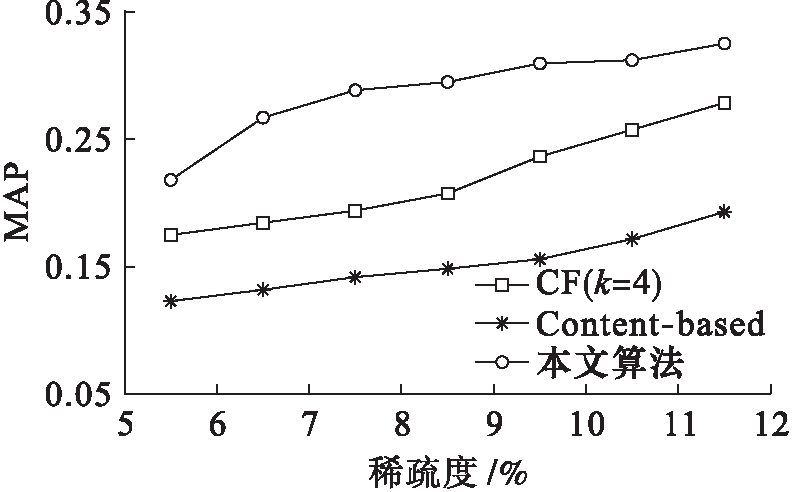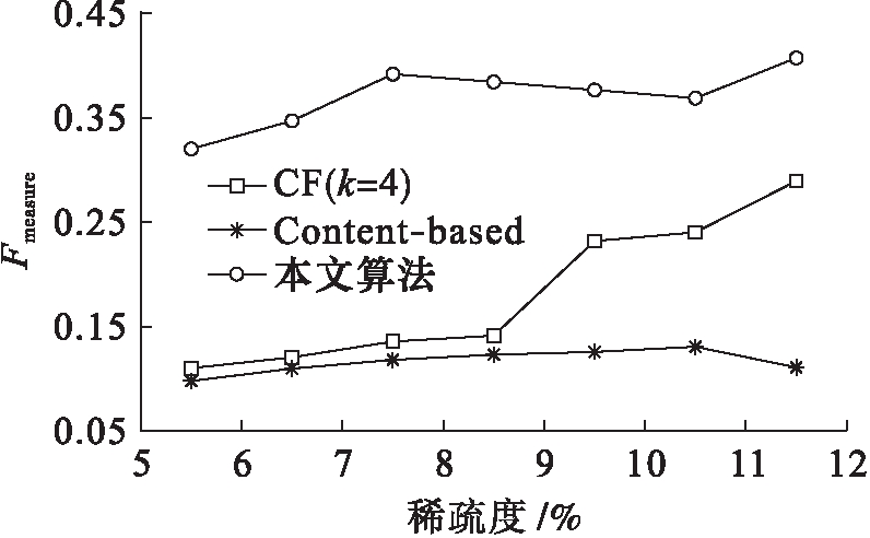 图4和图5分别表示不同数据稀疏度条件下,3种算法协同推荐Fmeasure指标与MAP指标的性能对比.综合图4、5可知,Content-based算法数据的稀疏性并不敏感,但推荐准确率一直保持在较低水平;而本文算法在数据极端稀疏时,仍能保证较高的推荐准确率,并随着数据密集度增大而不断上升.在3种算法中,本文算法在Fmeasure和MAP两项推荐准确率指标上都能获得最优的性能,且相比传统方法具有较为显著的提升.