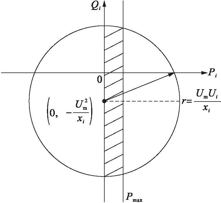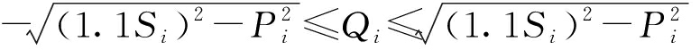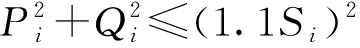 光伏逆变器的无功容量受逆变器的视在功率限制,若逆变器有功输出增多,则无功容量会相应减少.通常逆变器允许短时间工作在视在功率的1.1倍处,则第i台逆变器输出的有功功率和无功功率的关系为
