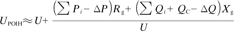 以电网电压U为基准,忽略电压降横分量及导纳参数,光伏电站并网点电压UPOIH(以下过程均以标幺值计算)可近似表示为