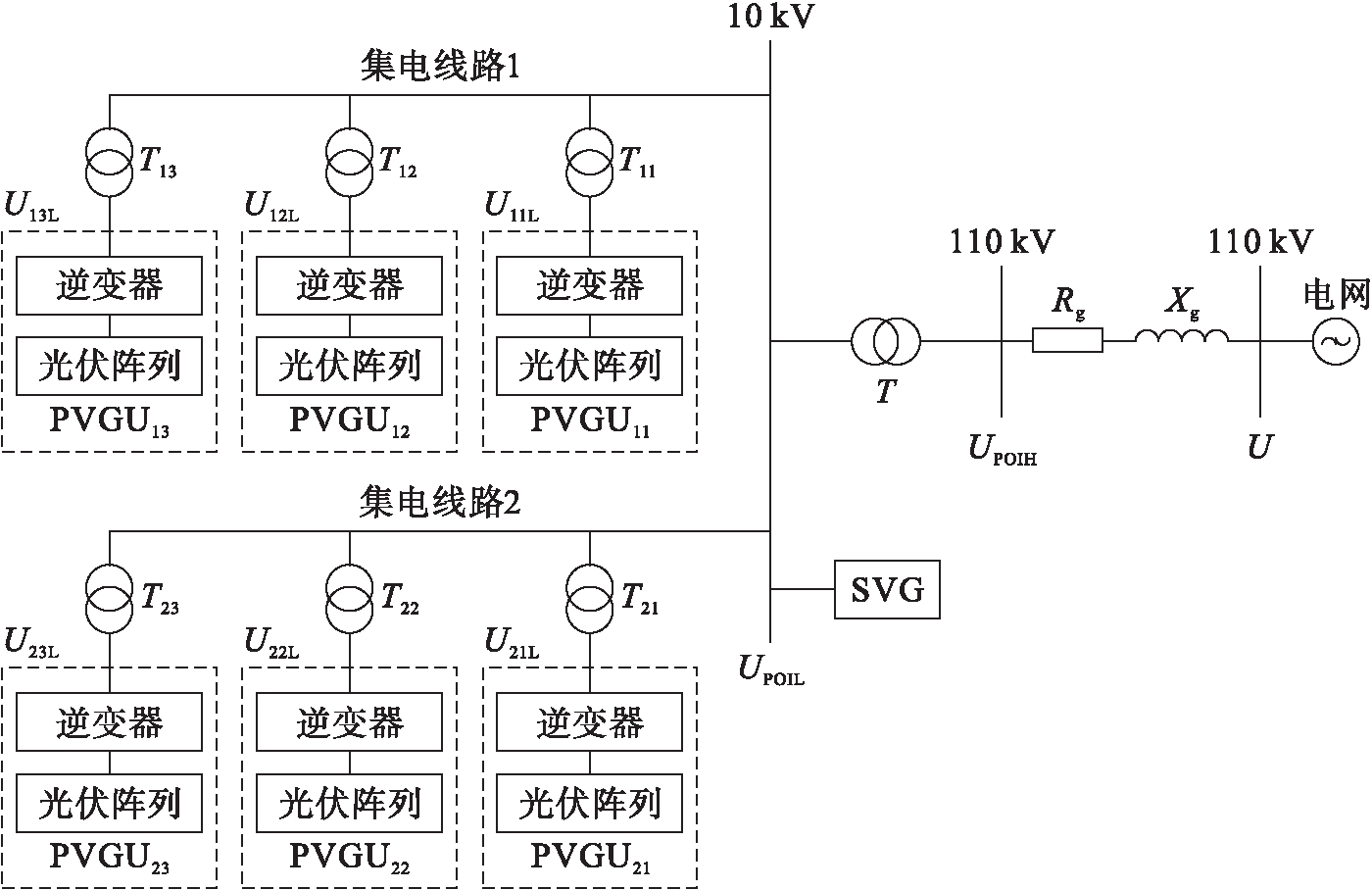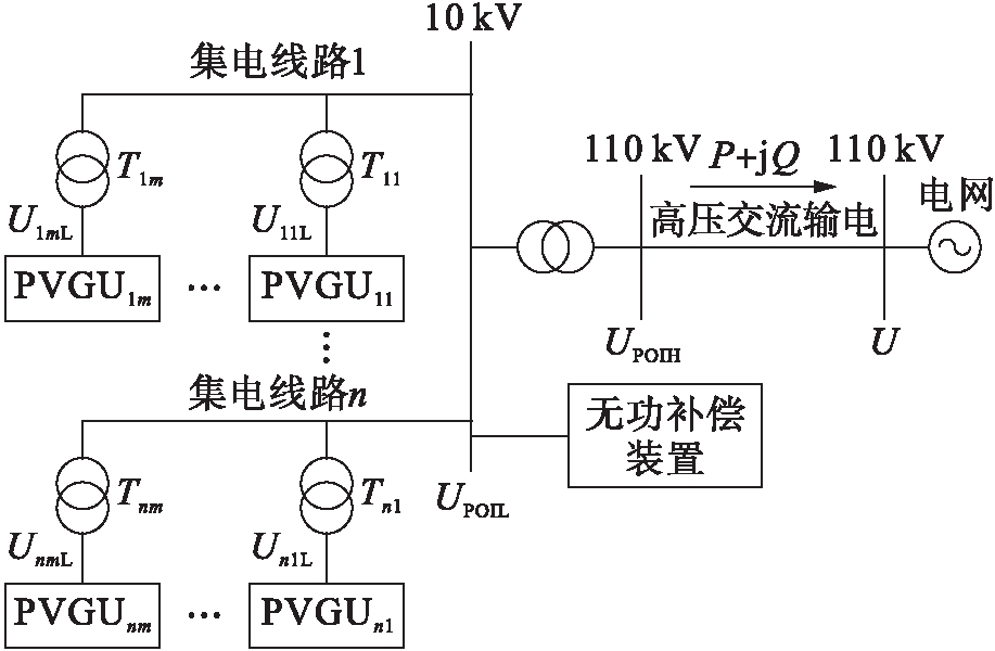 该光伏电站有n条集电线路,每条集电线路上接有m个光伏发电单元.光伏发电单元中的逆变器将光伏板发出的直流电逆变为400 V的交流电,经0.4 kV/10 kV升压变压器升至10 kV后接入集电线路,集电线路接入主变压器低压侧母线,再经主变压器升压至110 kV后通过高压交流输电线和大电网相连.