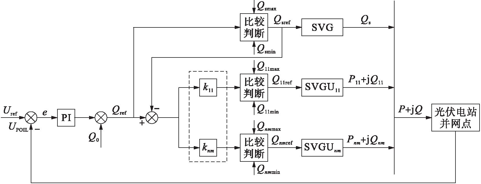 光伏电站无功优化协调控制策略如图5所示.图5中Uref为光伏电站并网点参考电压;Q0为无功初始量;Qref为无功参考量;ki为第i个光伏发电单元的无功分配系数;Qsmax和Qsmin分别为SVG的感性和容性无功容量;Qimax和Qimin分别为第i个光伏发电单元的感性和容性无功容量;Qsref和Qiref分别为SVG和第i个光伏发电单元分配到的无功参考量.