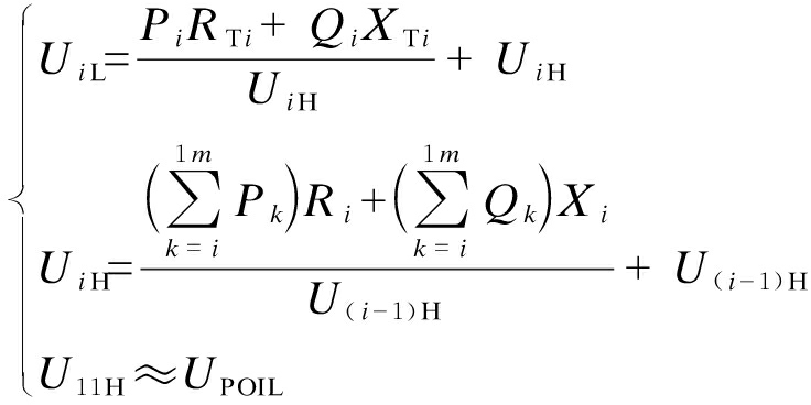图4中Pi+jQi为第i个PVGU发出的功率;Zi为连接第i个PVGU与第i-1个PVGU的集电线路阻抗;ZTi为第i个PVGU的升压变压器等效阻抗;BT为主变压器激磁导纳;UiL与UiH分别为第i个升压变压器低压侧和高压侧电压.
