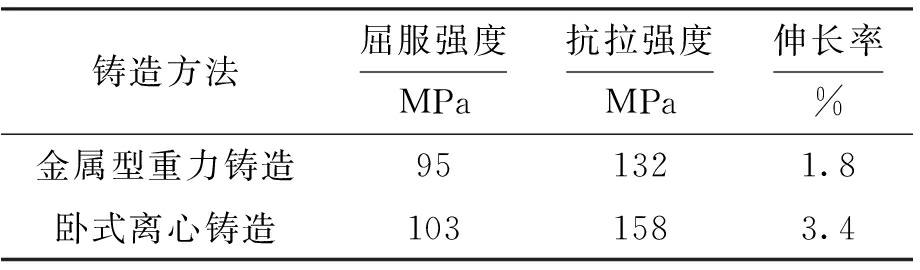 本文实验中r0约为0.38 m,γ约为1.81×104 N/m3,对于镁铝合金件而言,β一般取值为0.9~1.1,因而可以计算得到本文铸型转速为870~1 063 r·min-1.由于实际离心浇注中铸型转速应比计算转速值略高,因此,将铸型转速设定为1 100 r·min-1.