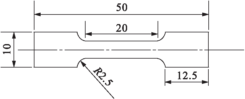 AZ91镁合金离心铸造管材(管材内壁取样)及自然凝固态铸件(圆柱中心取样)试样经线切割、镶嵌、抛光及自制腐蚀液腐蚀后,对其第二相含量及显微组织进行分析与比较.分别采用光学显微镜(OM)和电子显微镜(SEM)观察镁合金的显微组织;利用X射线衍射仪(XRD)分析镁合金凝固组织相的组成及含量;利用WGW-100H型电子万能材料实验机于室温条件下对试样进行拉伸实验,且实验机拉伸速度为0.2 mm/min,试样厚度为3 mm,具体拉伸试样尺寸如图1所示(单位:mm).