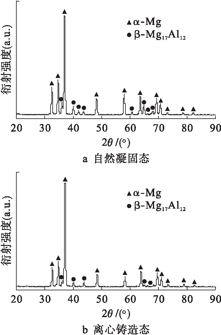 图4为自然凝固态AZ91镁合金金属型铸件与离心态AZ91镁合金管材的XRD图谱.由图4可知,在自然凝固态及离心态下镁合金的相成分均由α-Mg和β-Mg17Al12相组成.但与自然凝固态相比,离心态AZ91镁合金中β-Mg17Al12相衍射峰强度减小,个别衍射峰甚至消失,表明离心态AZ91镁合金管材中β-Mg17Al12相含量有所降低.这是因为卧式离心铸造属于亚快速凝固过程,凝固时传热速率较高,凝固过程具有极大的过冷度与凝固速率,从而很大程度上抑制了镁合金管材离心铸造凝固过程中共晶转变的发生.同时由于初生相凝固速度大于界面溶质原子的扩散速度,共晶转变来不及发生,因而β-Mg17Al12相尚未得到充分析出,凝固过程便已结束.然而,由于自然凝固态AZ91镁合金铸件具有充裕的时间来完成平衡凝固过程中的共晶转变过程,因此,β-Mg17Al12相可以得到充分析出.