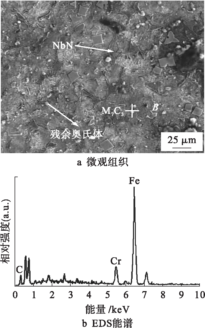 综合图4、5可知,堆焊层组织中呈四边形的亮白色相为NbN相,浅灰色析出相为碳化物M7C3型组织,而灰色相即为堆焊合金基体,结合XRD分析结果,可以推断出灰色相应该是由马氏体与残余奥氏体构成的基体组织.