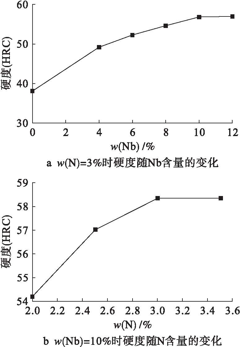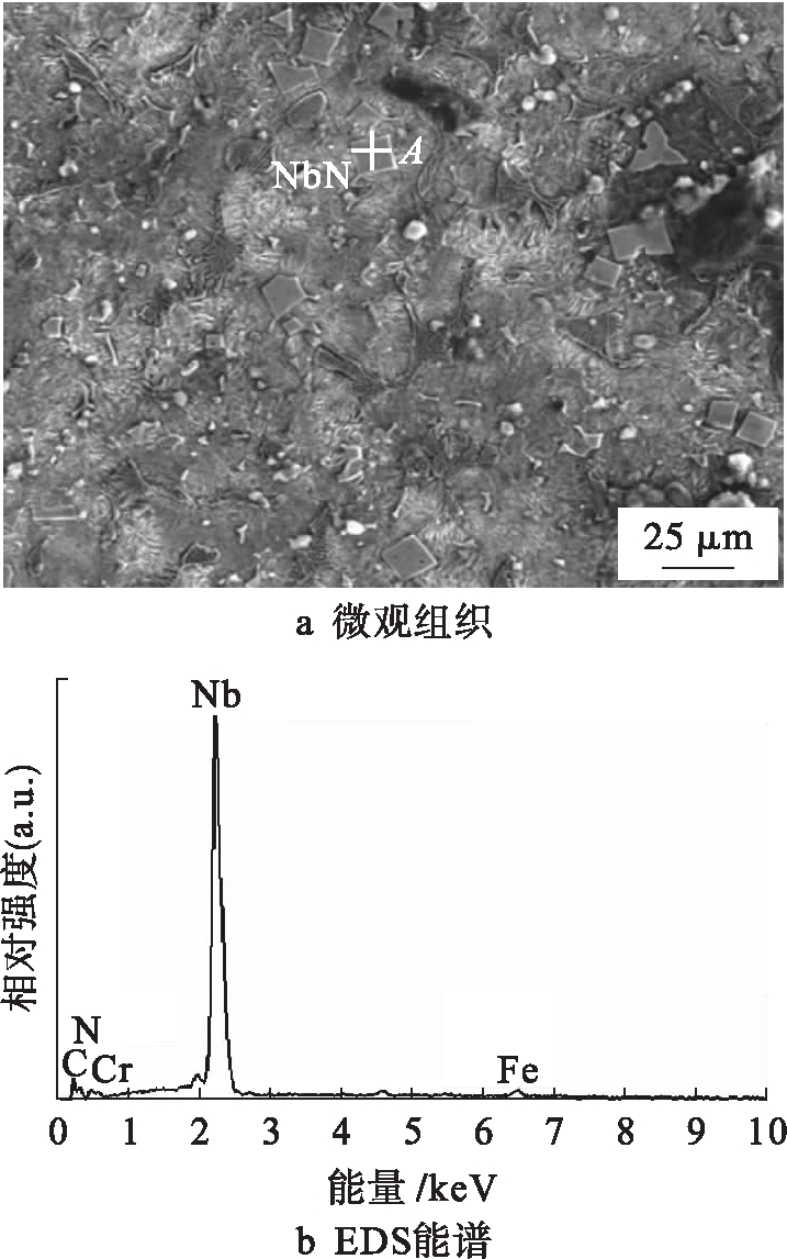 选用w(N)=2.5%、w(Nb)=8%的试样进行能谱分析.堆焊层组织与A点能谱如图4所示.由图4可见,A点处于四边形亮白色相区域,且主要由C、N、Nb及少量Cr、Fe等元素组成.结合XRD分析结果基本可以判断此四边形亮白色相为NbN相.这是因为此处Nb和N的含量很高,远超过其他元素的含量,因此,将此处判断为NbN硬质相是合理的.