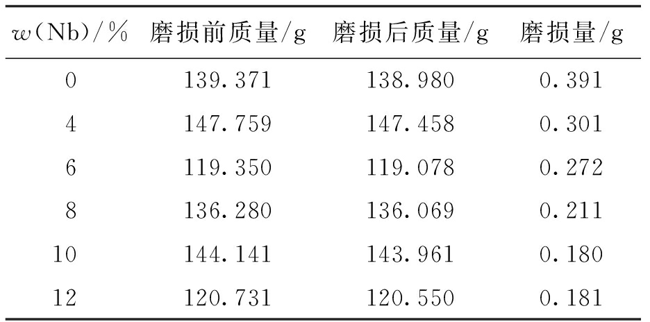 观察表3可以发现,随着Nb元素含量的增加,磨损量先减少后增加,当Nb元素的质量分数为10%时,试样的磨损量最小,表明此时试样的抗磨损能力最强.当Nb含量超过10%时,试样的磨损量随之增大,这是由于堆焊层整体硬度下降所致.同时,基体中部分硬质相会发生脆性断裂和剥落,而在剥落处留下的细小孔洞使得磨料的磨削作用成倍增加,与此同时这些硬度较高的细小块体脱落物本身也可以成为磨料的一部分,从而使得磨损加剧,进而导致堆焊层的磨损量有所增加.