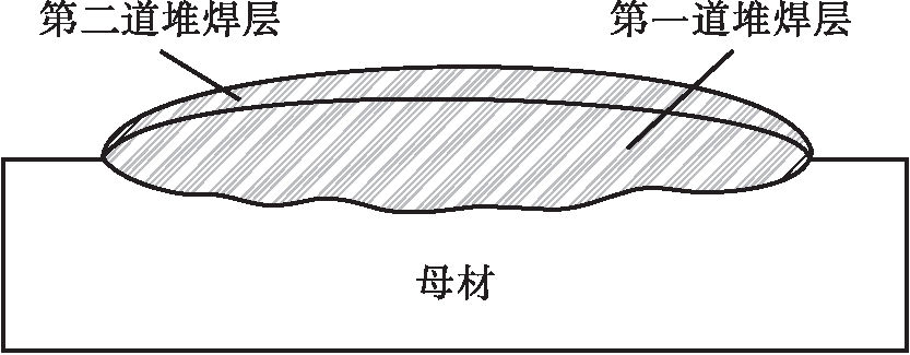 当进行堆焊试板的表面清洁时,需要采用角磨机清理掉试板表面的油污、铁锈与氧化皮等,必要时需要采用丙酮进行清洗.按照表1中的焊接工艺参数进行焊接.在具体焊接过程中,沿试板一侧进行连续纵向堆焊,由于母材对堆焊合金具有稀释作用,因此,焊板的第一道堆焊金属并不能充分反映出所研制药芯焊丝熔敷金属的成分、硬度和磨损失重情况.为了减少上述稀释作用的影响,需要将堆焊试板冷却到层间温度后再进行第二道堆焊,且第二道焊缝的中心位置应沿第一道焊缝的中心位置进行堆焊,堆焊试样截面示意图如图1所示.