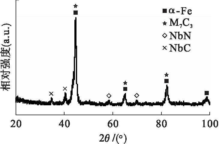 当堆焊层中N元素的质量分数为2.5%且Nb元素的质量分数为10%时,堆焊层的XRD图谱如图3所示.