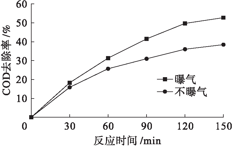 量取400 mL实际印染废水,填料投加量为0.2 kg,调节废水初始pH值为3,分别在曝气与不曝气两种条件下进行实验,实验结果如图3所示.