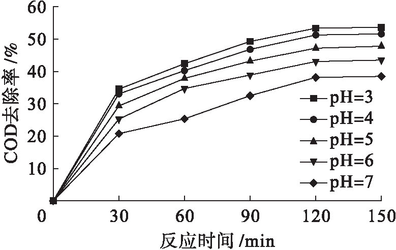 量取400 mL实际印染废水,填料投加量为0.2 kg,在曝气条件下废水初始pH值分别调节为3、4、5、6和7进行5组实验,实验结果如图2所示.