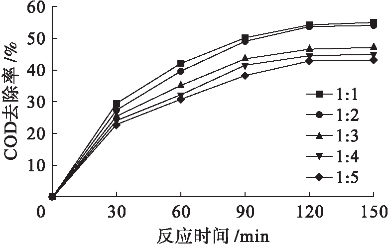 由图1可知,随着反应时间的延长,COD去除率不断增加.当反应时间达到150 min,且铁碳填料质量与废水体积的配比为1∶1和1∶2时,废水的处理效果较好,此时COD去除率可以分别达到55.16%和54.04%.这是因为微电解反应发生在填料表面,填料越多,形成的微观原电池数量就越多,因而可以加快有机物的降解速度,从而使得印染废水的COD降低更多.因此,综合考虑废水的处理效果,并兼顾填料的投加成本后,选取铁碳填料质量与废水体积的最佳配比为1∶2.
