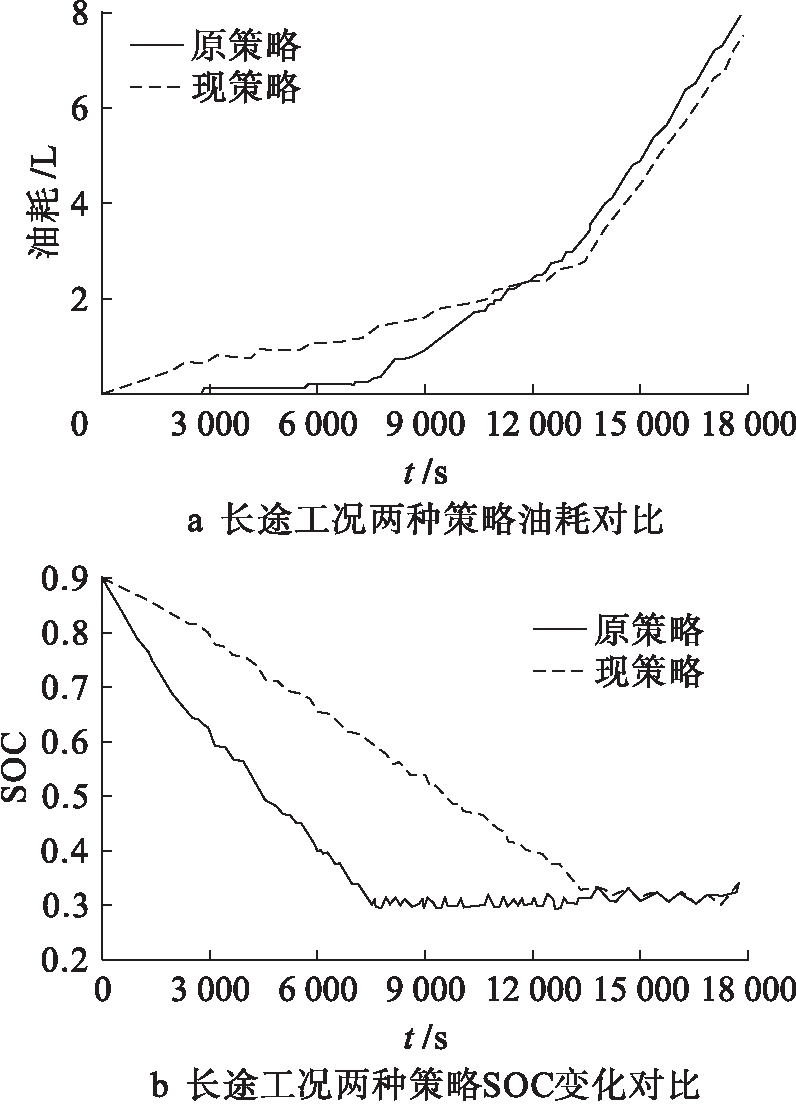 根据图7可知,该控制策略能够使得SOC在行驶至里程终点时刚好减至最小值,从而确保汽车全部运行在CD阶段;与原策略的油耗值相比,该控制策略的全程75.58 km总油耗在很大程度上小于原策略,其由3.0 L缩小至2.5 L.在中等长度的行驶条件下,该控制策略能够相对更好地节省总里程油耗.