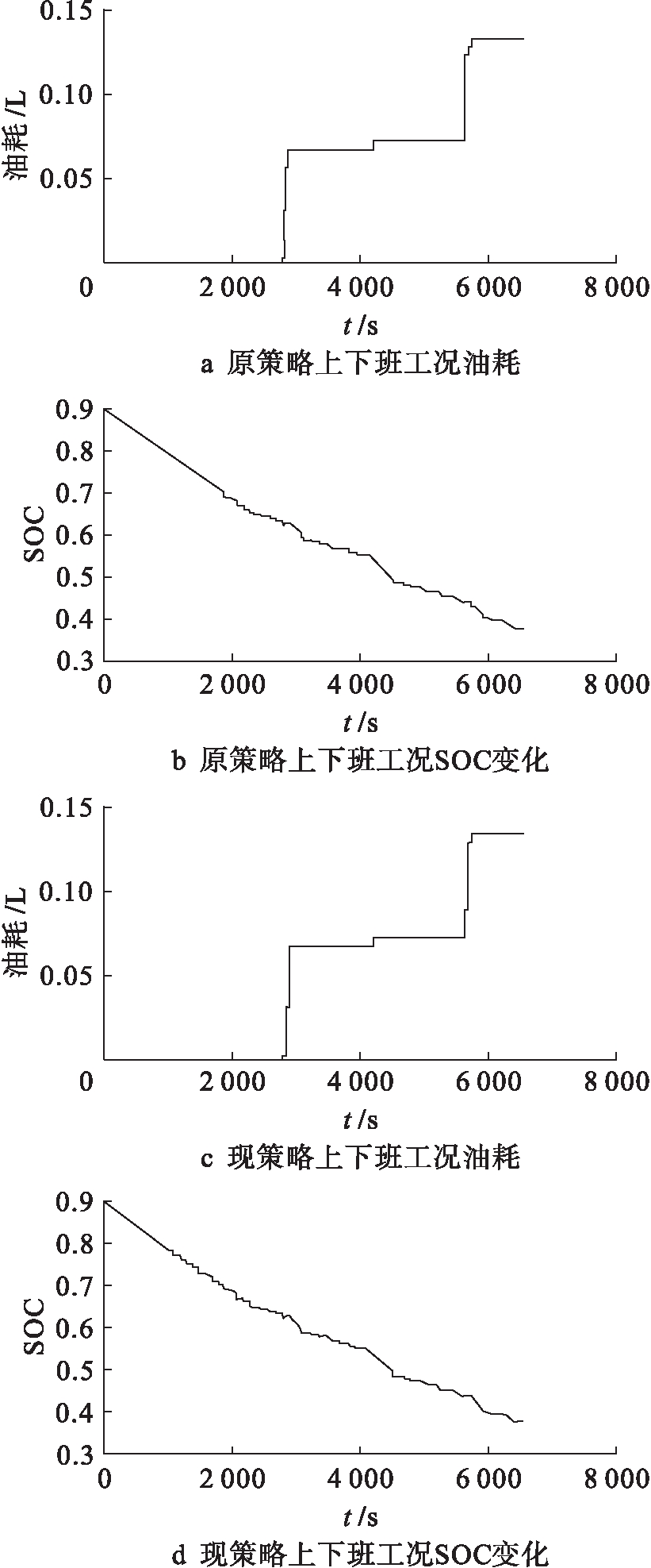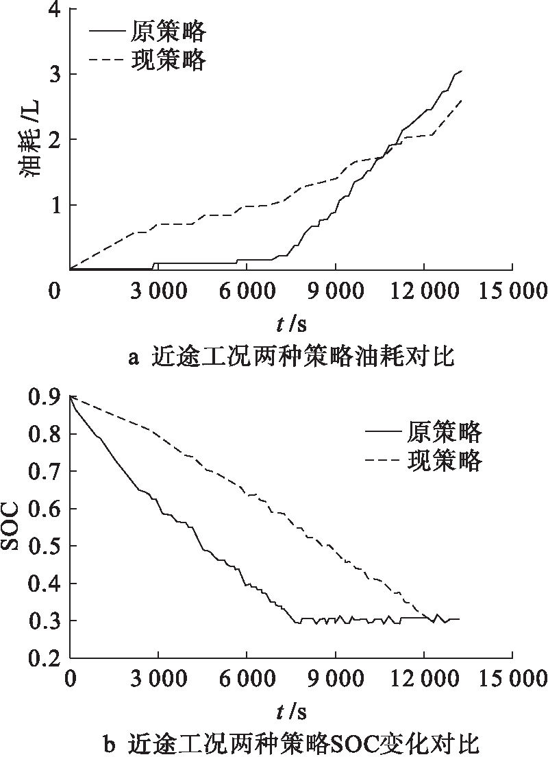 1) 城市上下班工况.该工况平均车速及总里程分别是15.21 km/h及27.78 km,依照策略划分择取主策略1,原策略与现策略对比仿真实验结果如图6所示.