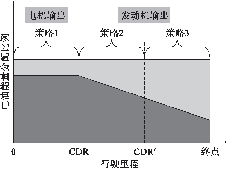 使用缩减纯电动范围的方法得到的最佳燃油经济性的成效随着汽车里程的逐步升高而慢慢减弱,直到与原策略[8](在不同的工况及行驶里程下,均以CD阶段以电为主、CS阶段电量维持的控制策略)的油耗基本一致.另外,如果纯电动范围相对很小,那么将导致无法最大程度地发挥电机在低速范围的驱动优势,将此时临界纯电动范围相应的CD阶段续驶里程称为CDR′[9],其具体划分如图5所示.