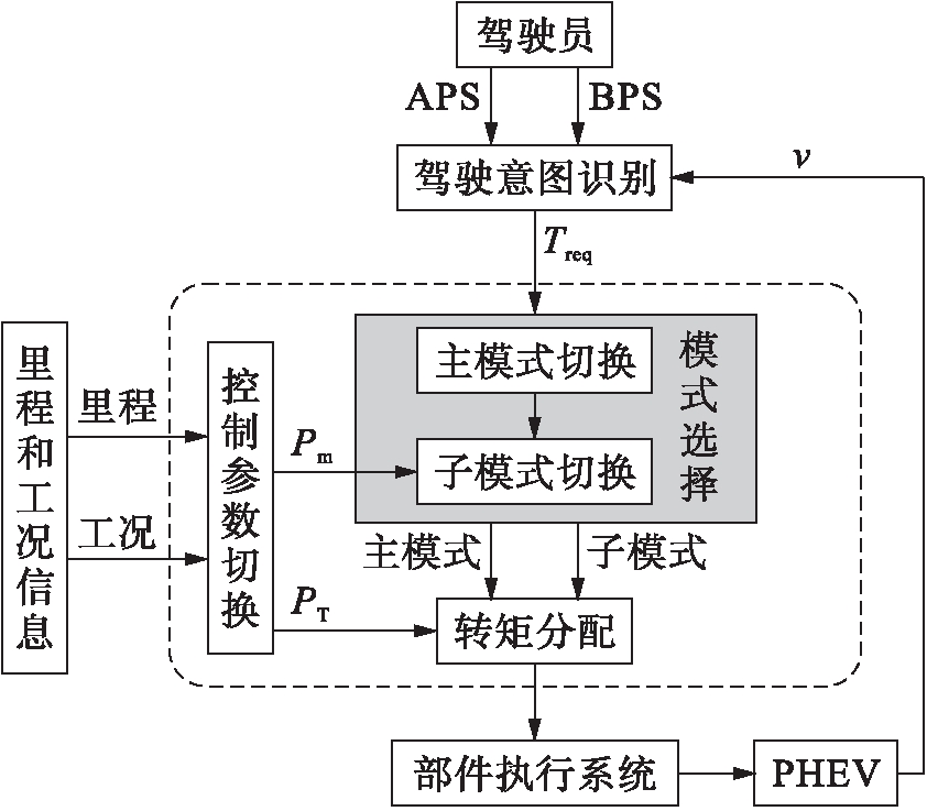 图1中APS及BPS分别为加速及制动踏板信号,v为此时此刻汽车的行驶速度,Treq为整车所需要的扭矩,Pm及PT分别为模式控制及扭矩分配参数.管理控制工作流程如下: