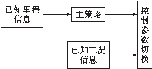 依照行驶里程以及工况信息完成能量管理控制策略的优化,能够在很大程度上展现插电式混合动力汽车双动力源的长处,从而获得相对更加优良的燃油经济性.全局优化根据行驶里程以及工况信息选择更加合适的电网充入电能分配方案,进而使电池荷电状态(state of charge,SOC)在达至终点时恰好能够减小至极小值.然而随着行驶里程的进一步升高,仅仅依赖把从电网充入的电能相对比较均匀地分发至全程无法实现相对更加优良的经济性,因此,务必搜索相对更加完善的控制策略.本文使用的插电式混合动力汽车参数如表1所示,采用行驶里程择取能量管理的主策略,随后再依照工况完成优化,其控制策略如图3所示.