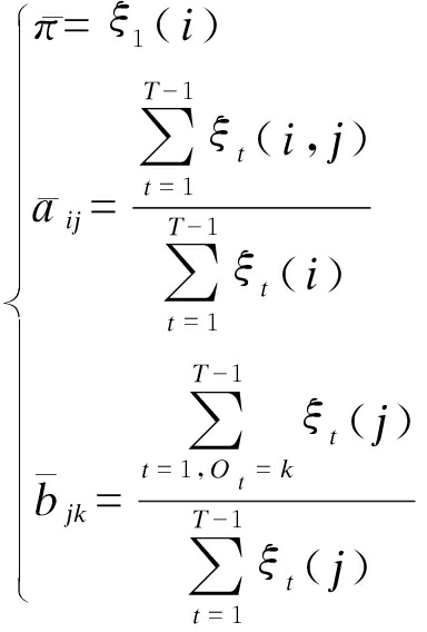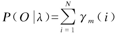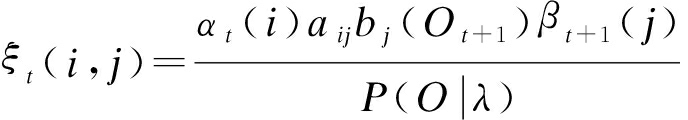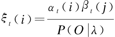 式中:αt(i)和βt+1(j)分别为t、t+1时刻处于状态θi条件下产生序列O的概率;aij为状态转移矩阵中的对应元素;bj(Ot+1)为观测符号矩阵中的对应元素.则t时刻马尔可夫链处于状态θi的概率为