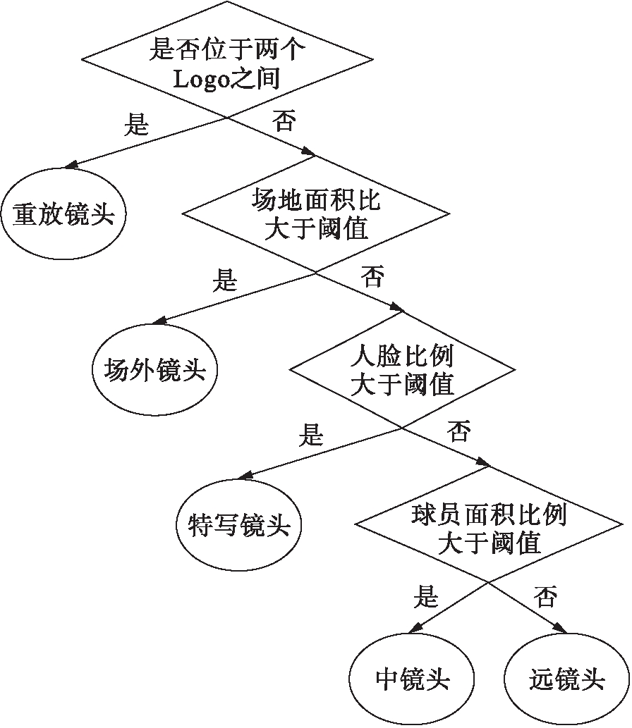 4) 按顺序两个Logo镜头之间的镜头就是重放镜头.决策树的第2层则是通过颜色直方图来判断场地面积,以此将非重放镜头分为场内镜头和场外镜头;第3层通过计算人脸比例提取场内镜头中的特写镜头;第4层通过计算场地和球员面积比例将剩下的场内镜头分为远镜头和中镜头.决策树流程图如图2所示.