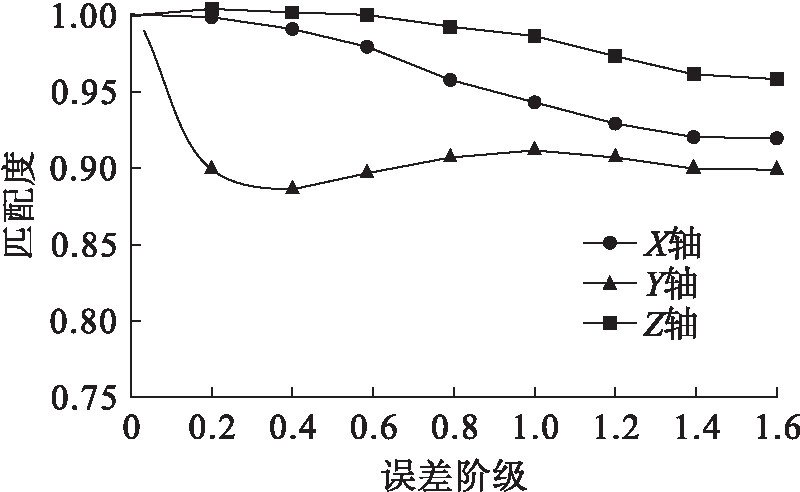 计算出本文方法旋转三个坐标轴的三维视觉特征匹配度,并绘制成曲线图,结果如图8所示.本文方法在三个坐标轴上的匹配度受旋转误差影响不大,基本维持在0.9以上,表明其具有鲁棒性强的性能优势.
