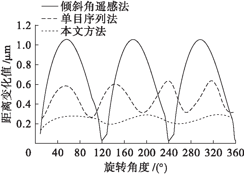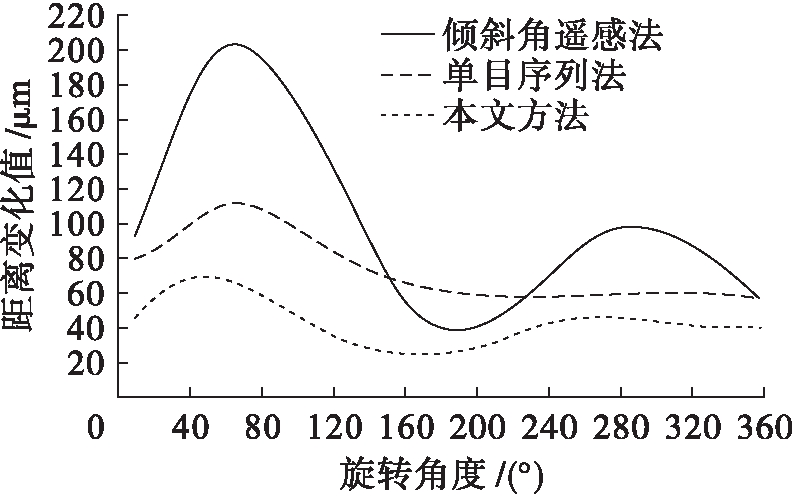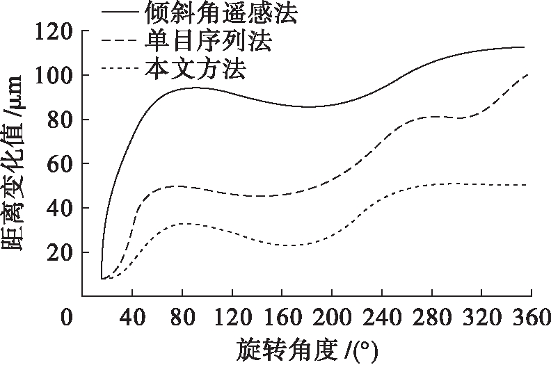 从三个坐标轴的变化曲线中可以看到,Y轴的距离特征变化值最大,呈波动上升趋势,其次是X轴,呈波动下降趋势,Z轴呈现出的是一种近似周期性、小规模的特征变化.对于倾斜角遥感法和单目序列法来说,本文提出的三维视觉法距离特征变化值最小,鲁棒性最强.