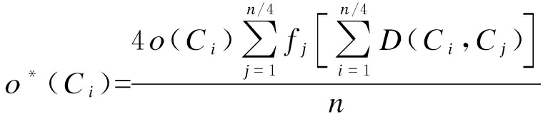 三维视觉服装图像的对比度定义为任意像素点Ci与其他像素点Cj的色彩度距离总和[11].由对比度定义可知,色彩度一致的像素点,其对比度显著性o(Ci)也是相同的,其表达式为