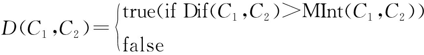 式中:true为“应该融合”;false为“不应该融合”;MInt(C1,C2)为利用最小生成树构造最小比重的像素树,其表达式为