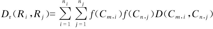 式中:ni、nj为两个切割块的色彩度总量;f(Cm,i)为Ri中色彩Cm,i的显示比重;f(Cn,j)为Rj中色彩Cn,j的显示比重.