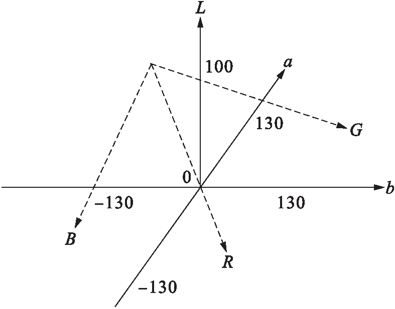 图3为RGB同Lab的坐标转换原理图.由图3可以获取Lab坐标的取值范围,其中,L为亮度,也就是黑白单色,取值为0~100;a为红绿色彩区间,取值为-130~130;b为黄蓝色彩区间,取值同红绿色彩区间.
