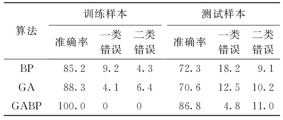 Tab.4 Comparison in error of BP,GA and GABP algorithms %