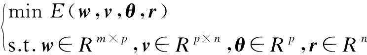 神经网络(BP)算法是一种借鉴人体神经元结构来进行信息处理和计算的智能算法,具有高度的自组织性和自学习性等优点,善于处理推理、判断等问题,但该算法也存在收敛速度慢、容易陷入局部极小值和网络泛化能力差等缺点[7-8].为了避免BP算法的上述缺陷,本文引入了GA遗传算法,将这两种算法结合到一起来进行计算,并对网络的安全程度进行计算和评价.在算法中,令E为目标函数,w和v分别为输入层到隐含层、隐含层到输出层的权值矩阵,θ和r分别为对应的阈值矩阵,m为输入层的数量,n为输出层的数量,p为隐含层的数量,则GABP算法的数学表达式为