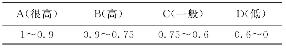 在网络安全评价研究领域,评价结果可以分为A(很高)、B(高)、C(一般)、D(低)4个等级,设满分为1分,这些等级的评分分布如表1[10]所示.