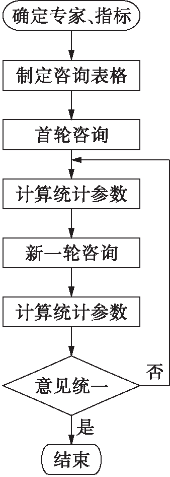 为建立科学的评价指标体系,本文引入了德尔菲法(Delphi),该方法使用了背对背的方式咨询专家小组的意见,小组成员匿名发表意见,同时成员之间不允许相互讨论,通过这样多轮的反复询问和反馈修正,得到集中的预测意见,从而总结出符合实际情况的预测结论.这种方法也叫专家意见法,具有匿名性、反馈性和优良的统计特性,能够结合多个专家主观意见和客观规律,可以对大量无法定量分析的指标进行相对准确的估算.首先确定专家小组的所有成员和若干评价指标,制作出成员需要填写的咨询表格,然后进行首轮初步咨询,并计算需要统计的参数,进行多轮咨询并反复修正专家意见,最后统一专家成员的意见,本文使用德尔菲法流程图如图1所示[6].