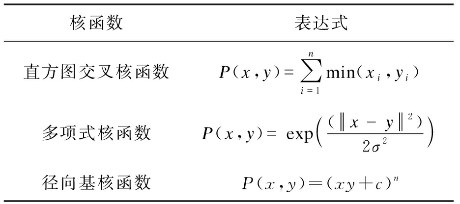 由于多核学习多采用基本核函数,如表1所示的直方图交叉核函数、多项式核函数和径向基核函数等,因此,可以将多核学习问题转化为权重系数的求解问题.近年来,针对组合核优化的问题提出了诸多解决方法,如文献[12]中提出了使用一种凸优化的方法——半定规划(semi definite programming,SDP)求解该问题,SDP可以求解不同核函数的组合系数,具有较强的泛化能力;文献[13]中提出了基于序列最小化的方法处理中等规模的优化问题;文献[14]中使用半无限线性规划解决较复杂的多核学习问题;文献[15]中使用梯度下降法来解决多核学习问题,具有较高的效率和更快的收敛速度,该方法又称为单多核学习方法.
