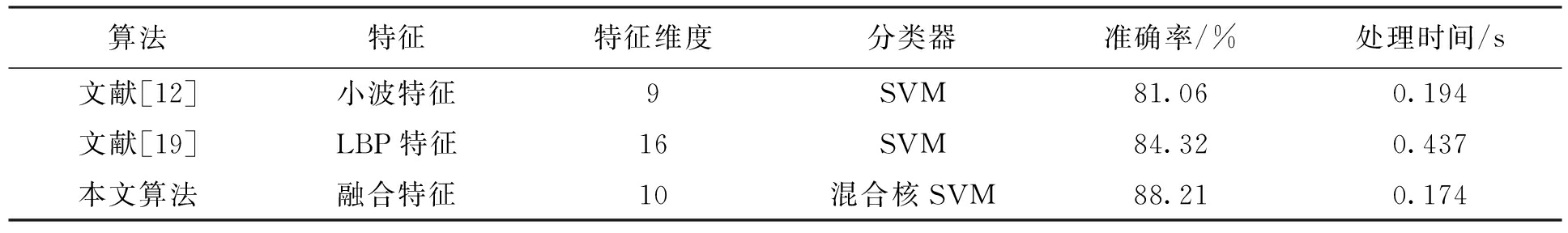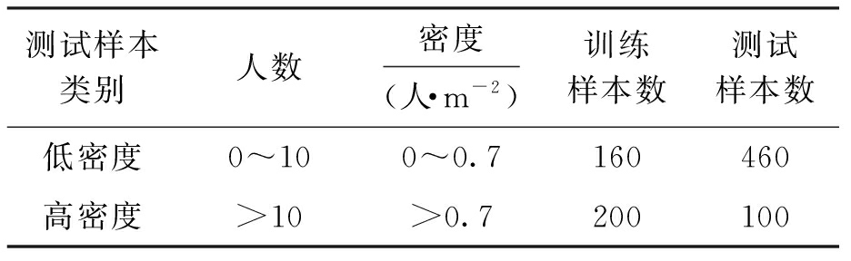 用上文提出的特征提取、融合与分类方法对公共场所的人群密度进行分类,分别采集商场高峰期和平峰期的920对490×455像素的红外与可见光图片进行训练及测试.其中,包括360对训练图片和560对测试图片,并将人群密度分为低高两类.本文设置各特征权重相同均为1,直方图交叉核函数、多项式核函数和径向基核函数的权重分别为0.3、0.4、0.3,SVM的惩罚因子值为0.1.实验样本具体分布情况如表2所示.