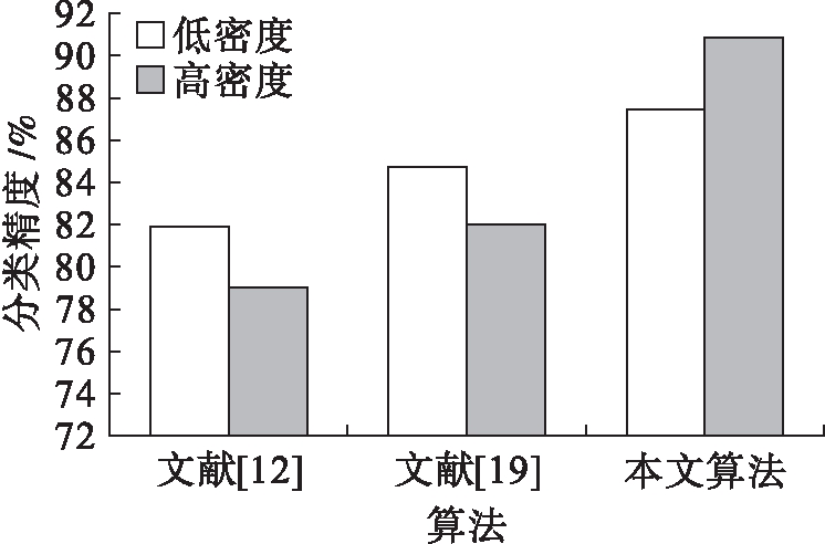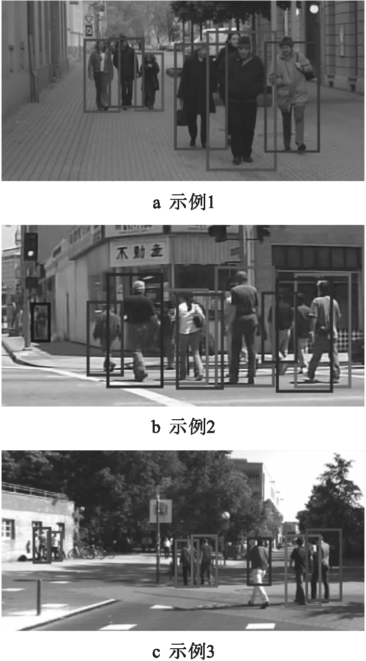 将本文算法分别与文献[12]提出的基于小波特征的方法和文献[19]提出的基于LBP特征的方法进行比较,结果如表6所示.从表6中可以看出,本文算法分类精度更高,提取出的特征相对较少,平均处理时间更短.不同算法对高、低密度人群的具体分类精度如图3所示,可以看出本文算法对高密度与低密度人群均具有更优的分类精度.本文算法检测结果如图4所示,从图4中可以看出,本文算法对各种密度人群都具备较高的检测精度.