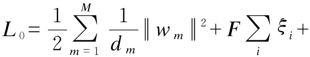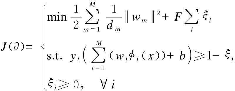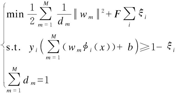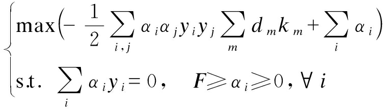 式中:wm为权重量;b为线性分类器的偏移值;F为惩罚因子;ξi为松弛变量;dm为权重系数;φi(x)为非线性映射核函数.将式(11)拉格朗日化后可以得到
