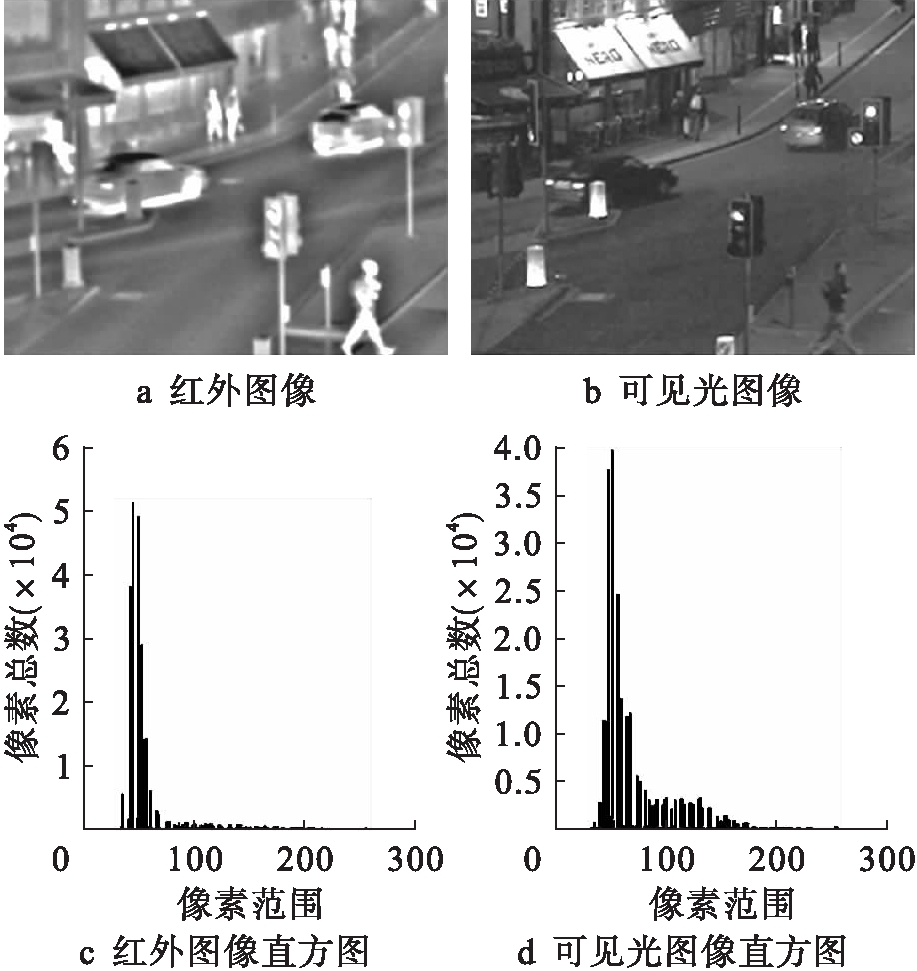 图像的灰度直方图刻画了图像灰度级的分布情况,其通过统计图像中每种灰度值像素点的个数来表征图像的全局特征.红外和可见光图像均蕴含着大量的灰度信息,也具有丰富的纹理细节信息.红外和可见光图像及其对应的灰度直方图如图1所示.从图1中可以看出,不同传感器获取的图像具有不同的分布特点,凸显出不同的图像特征.
