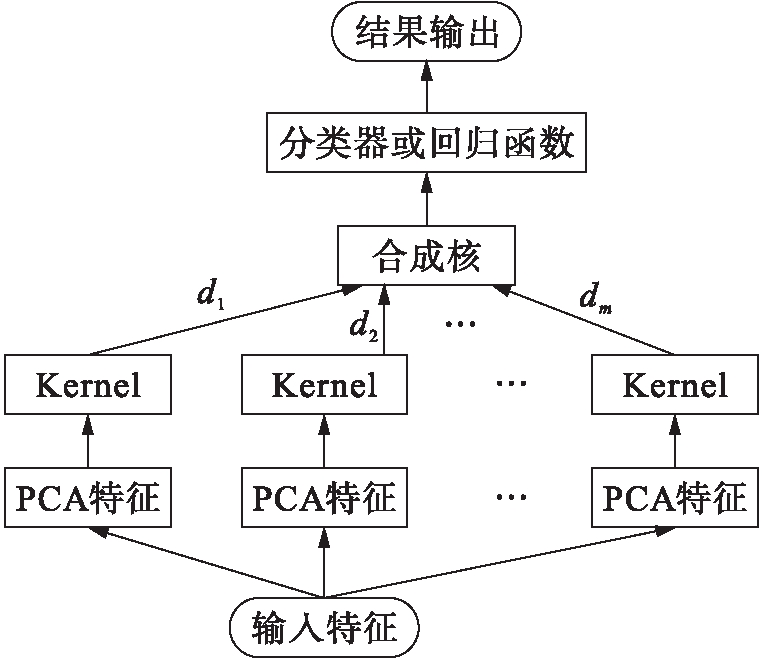 支持向量机[5](support vector machine,SVM)的本质为核方法,在解决非线性、小样本和高维模式识别问题中表现出了诸多优势[6-8],然而,每一种核具有较大的差异,对应于不同的应用场合.目前,尚未出现完备的选择核函数的理论依据,因此,选择与设计适合给定问题核函数是核方法和SVM共同面临的问题.当数据样本存在多维数据不规则、含异构信息或高维空间分布不平坦等问题时,难以使用单一的核函数映射处理所有样本[9-10].